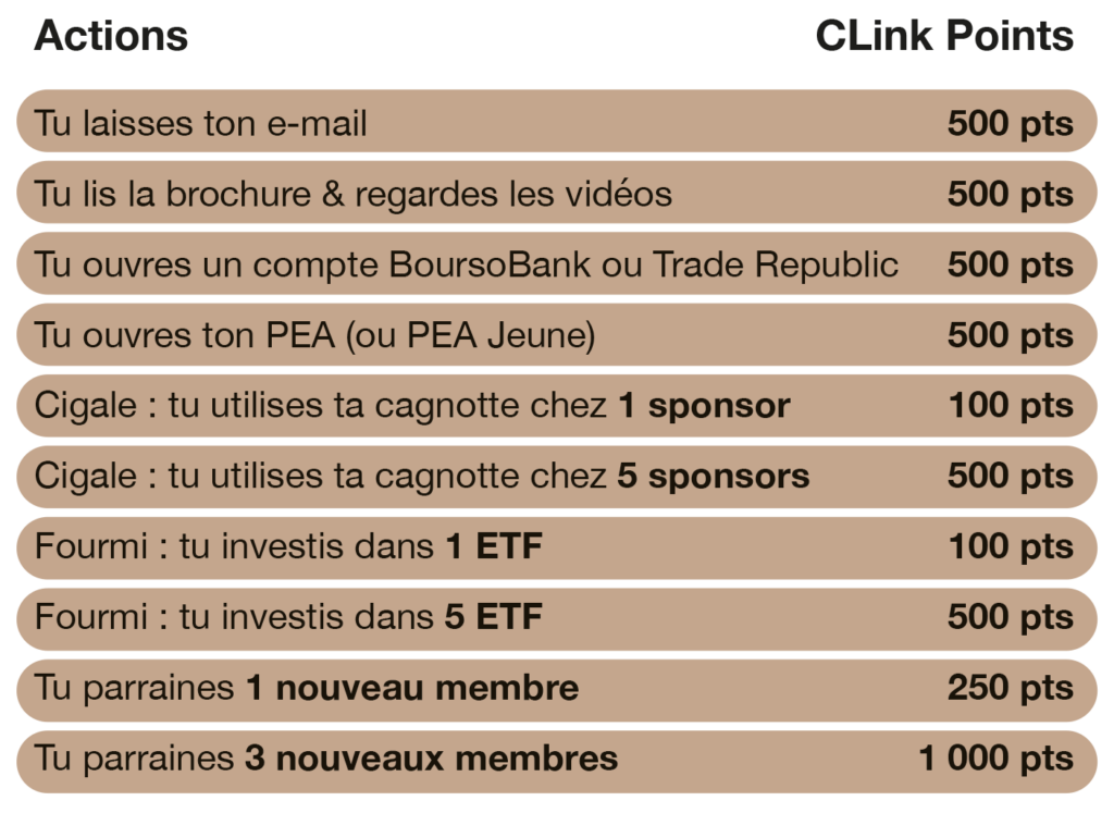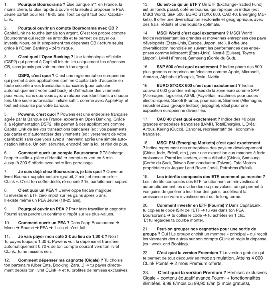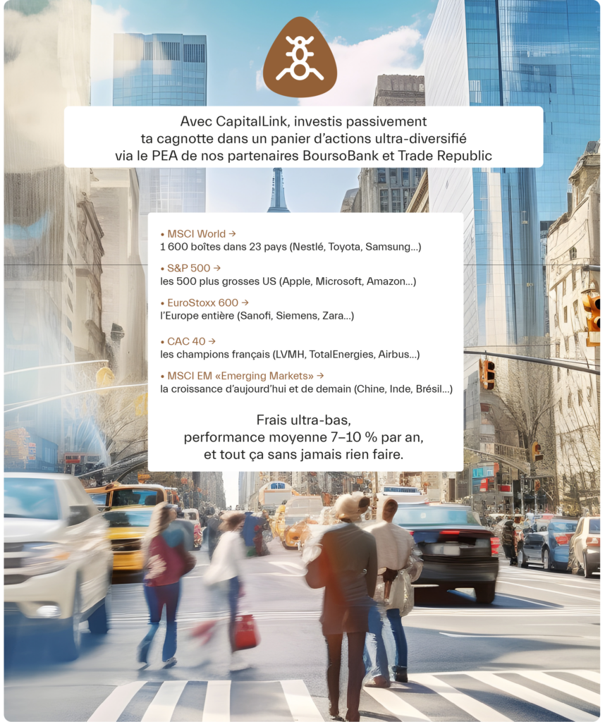 CapitalLink ne fournit aucun conseil en investissement. Les ETF listés (MSCI World, S&P 500, EuroStoxx 600, CAC 40, Emerging Markets) sont présentés à titre éducatif uniquement. Toute décision financière relève de votre responsabilité. Nous redirigeons vers des plateformes agréées AMF (Boursorama, Trade Republic) – CapitalLink n’exécute pas d’ordres et ne gère pas vos fonds. Les performances passées ne préjugent pas des résultats futurs. Risque de perte en capital possible.
